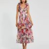Mac Duggal Women’s Dresses Beige Illusion Floral Midi Dress With Ruffle Detailing | Beige Multi