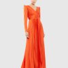 Elegant jersey gown accented with a bead-and-rhinestone embellished halter neck and a thigh-high slit.