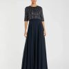 Make a stunning entrance in this long sleeve gown with rhinestone-embellished shoulders, a cascading side ruffle, and a high slit, perfect for galas, weddings, and formal events.