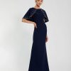 The Embellished Column Cape Gown by Mac Duggal offers a stunning, fully lined bodice and skirt, with a sheer, unlined cape overlay with hand beaded and sequin details. The boat neckline and cape sleeves create an elegant silhouette, while the asymmetrical cape overlay and sweeping train add a touch of drama.
