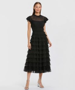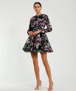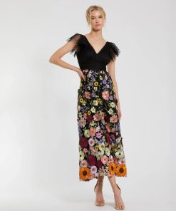 Mac Duggal Women’s Dresses Black Multicolor Embroidered Flutter Sleeve Floral Dress | Black Multi