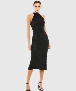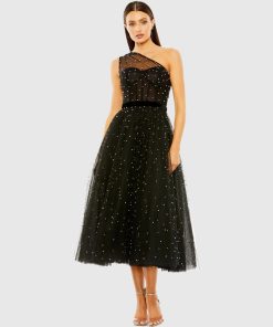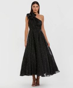 Mac Duggal Women’s Dresses Black Pearl Embellished One Shoulder Organza Midi Dress | Black