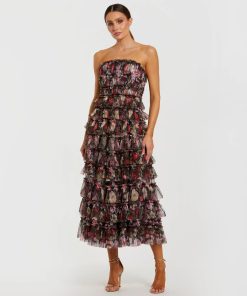 Mac Duggal Women’s Dresses Black Multicolor Strapless Micro Ruffle A Line Midi Dress | Black Multi
