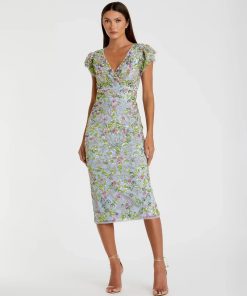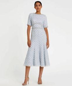 Mac Duggal Women’s Dresses Blue Short Sleeve Beaded Trim Boucle Midi Dress | Blue Multi