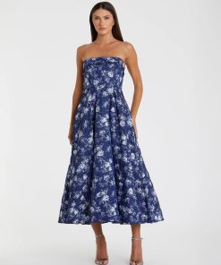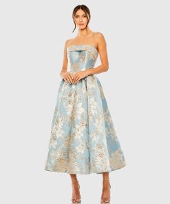Mac Duggal Women’s Dresses Blue Strapless Brocade Midi Dress With Pockets | Blue Multi