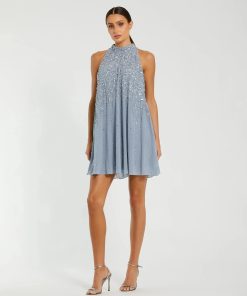 Mac Duggal Women’s Dresses Blue High Neck Sleeveless Sequin Embellished Trapeze Dress | Powder Blue