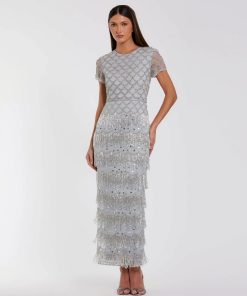 Mac Duggal Women’s Dresses Blue Fringe Embellished Mesh Ankle Length Dress | Seafoam