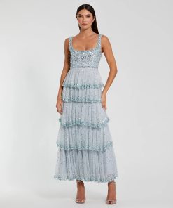 Mac Duggal Women’s Dresses Blue Embellished Net Tiered Ruffle Scoop Neck Dress | Powder Blue