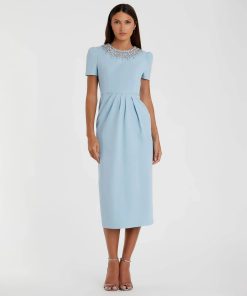 Mac Duggal Women’s Dresses Blue Short Sleeve Rhinestone Neckline Sheath Dress | French Blue