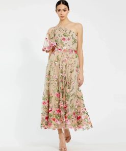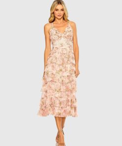 Mac Duggal Women’s Dresses Pink Sleeveless V Neck Floral Mesh Ruffle Midi Dress | Blush Multi