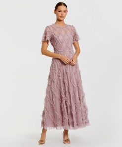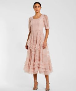 Mac Duggal Women’s Dresses Pink Short Sleeve Mesh Micro Ruffle Midi Dress | Porcelain