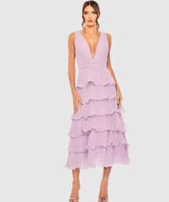 Mac Duggal Women’s Dresses Purple Deep V Chiffon Sleeveless Ruffle Midi Dress | Purple