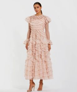 Mac Duggal Women’s Dresses Pink Tiered Ruffle Trim Long Sleeve Midi Dress | Porcelain