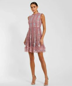 Mac Duggal Women’s Dresses Pink Sleeveless High Neck Embroidered Mini Dress | Berry
