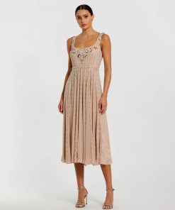 Mac Duggal Women’s Dresses Pink Sleeveless Scoop Neck Embellished Midi Dress | Rose