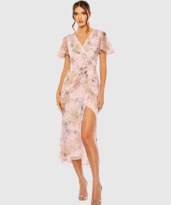 Mac Duggal Women’s Dresses Pink Printed Mesh Flutter Sleeve Faux Wrap Midi Dress | Pink