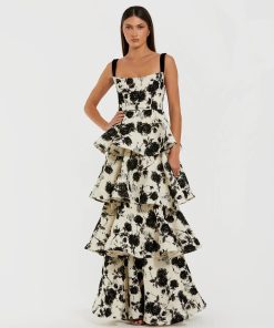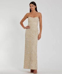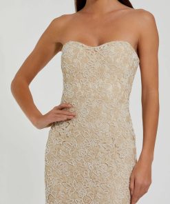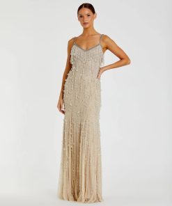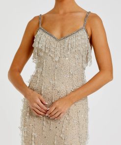 Mac Duggal Women’s Dresses Beige V-neck Column Gown With Fringe Embellishments | Nude Silver