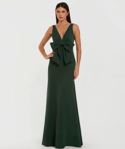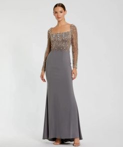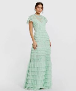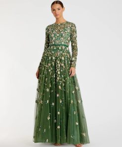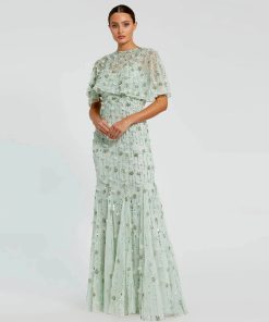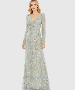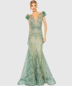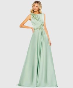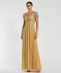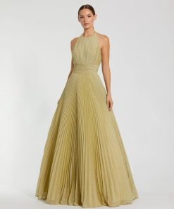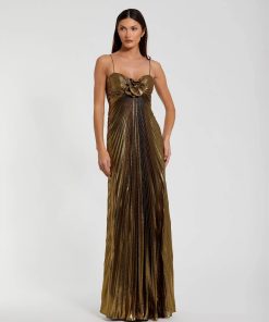 Mac Duggal Women’s Dresses Gold Thin Strap Pleated Metallic Gown With 3d Flower | Antique Gold