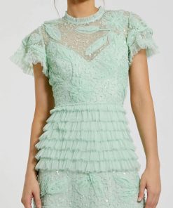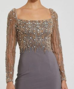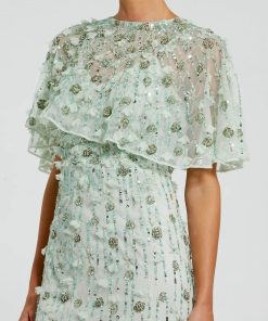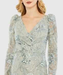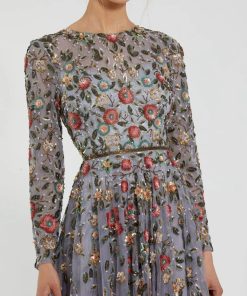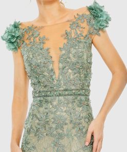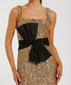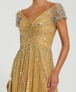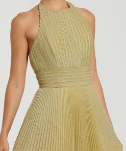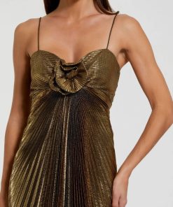 Mac Duggal Women’s Dresses Gold Thin Strap Pleated Metallic Gown With 3d Flower | Antique Gold