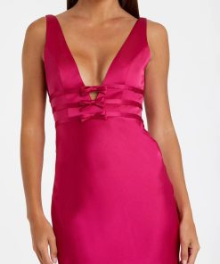Mac Duggal Women’s Dresses Hot Pink Sleeveless V Neck Satin Gown With Bow Details | Raspberry