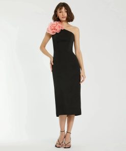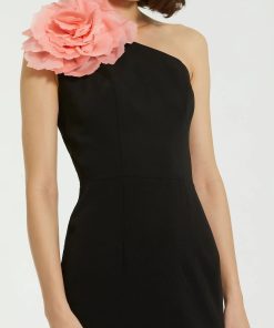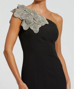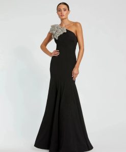 Mac Duggal Women’s Dresses Black Crepe One Shoulder Beaded Midi Dress With Bow | Black