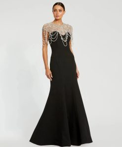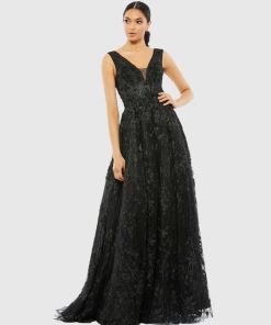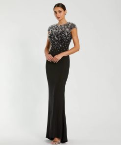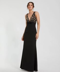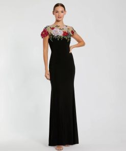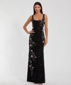 Mac Duggal Women’s Dresses Black Floral Beaded Mesh Scoop Neck Sleeveless Gown | Black Multi