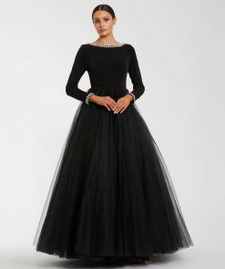 Mac Duggal Women’s Dresses Black Embellished Jersey Long Sleeve Ballgown With Tulle Skirt | Black