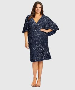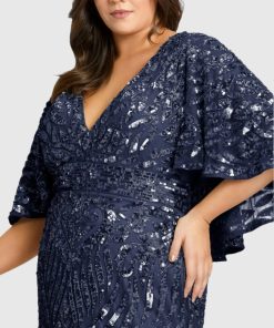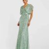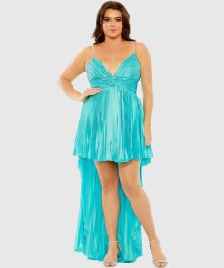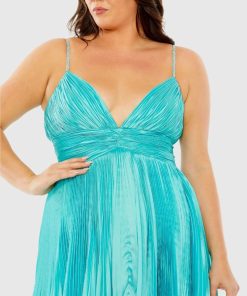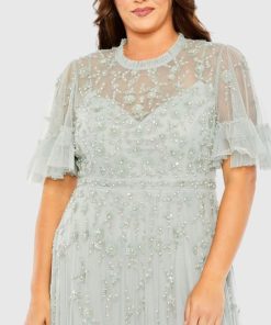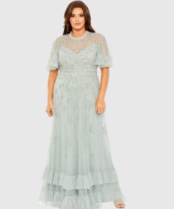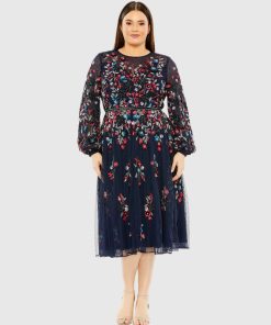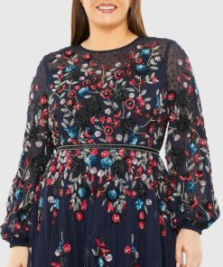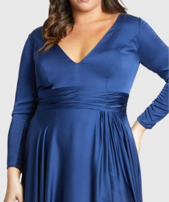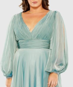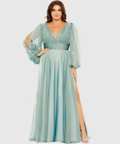 Mac Duggal Women’s Dresses Blue Puff Sleeve W/ Embellished Cuff V Neck A Line Gown (plus) | Blue