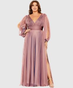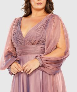 Mac Duggal Women’s Dresses Pink Puff Sleeve W/ Embellished Cuff V Neck A Line Gown (plus) | Pink