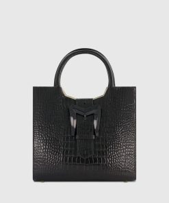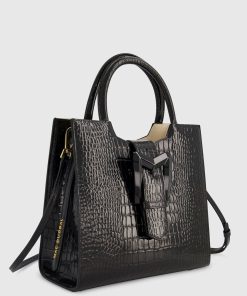 Mac Duggal Women’s Black Buckled Medium Croco Leather Tote Bag With Detachable Strap | Black