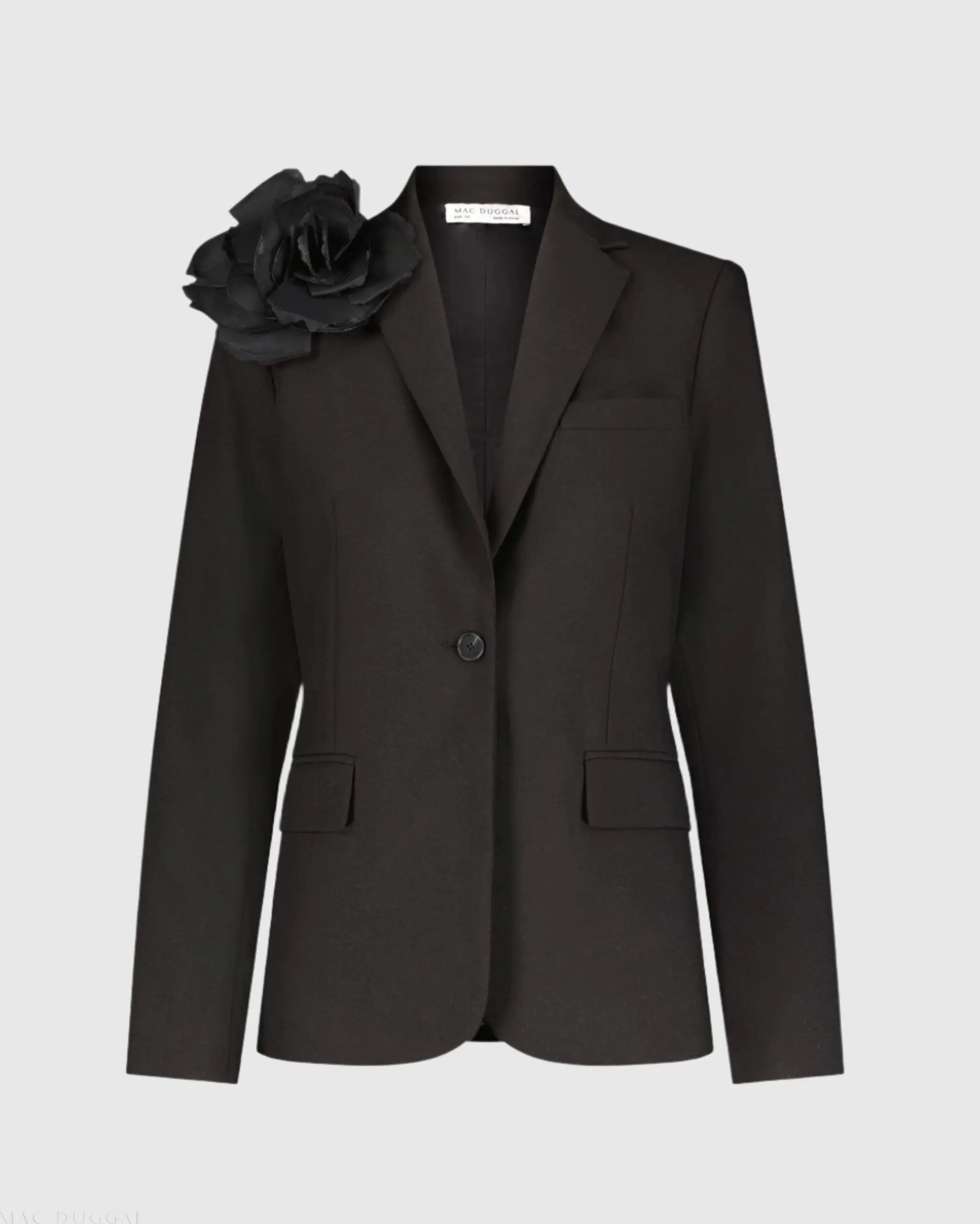 Be the first to review “Mac Duggal Women’s Black Classic Crepe Blazer Jacket With Flower – Final Sale | Black” Cancel reply
