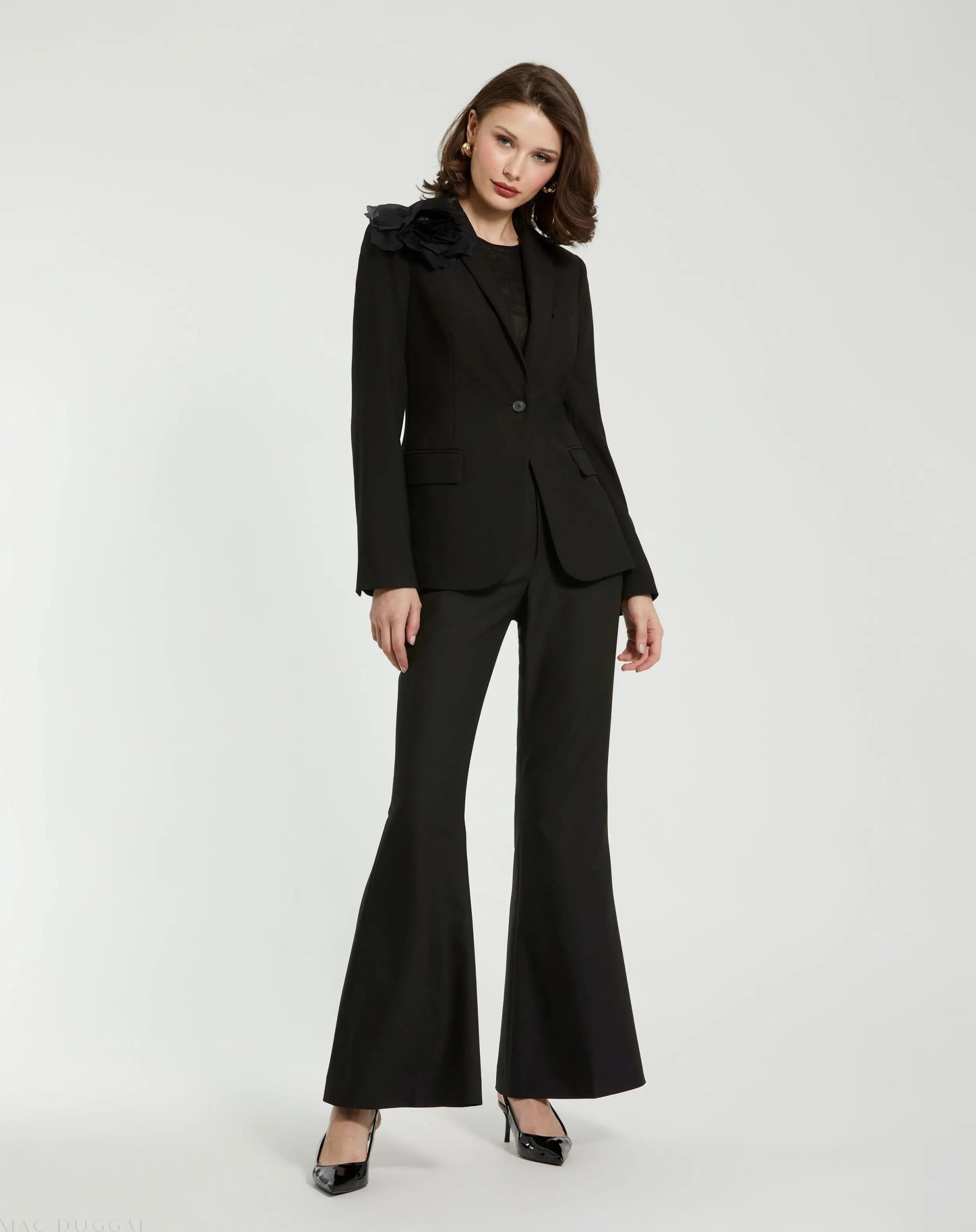 Experience sophistication and elegance in our Classic Crepe Jacket. Adorned with a floral accent, this piece combines classic tailoring with charming detail. Whether worn over a dress or paired with our flare leg pants for a matching suit, this tailored jacket is sure to elevate any look.