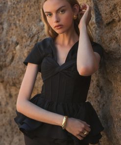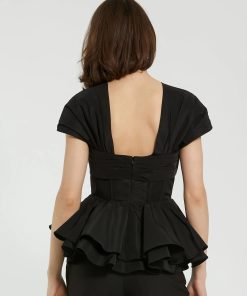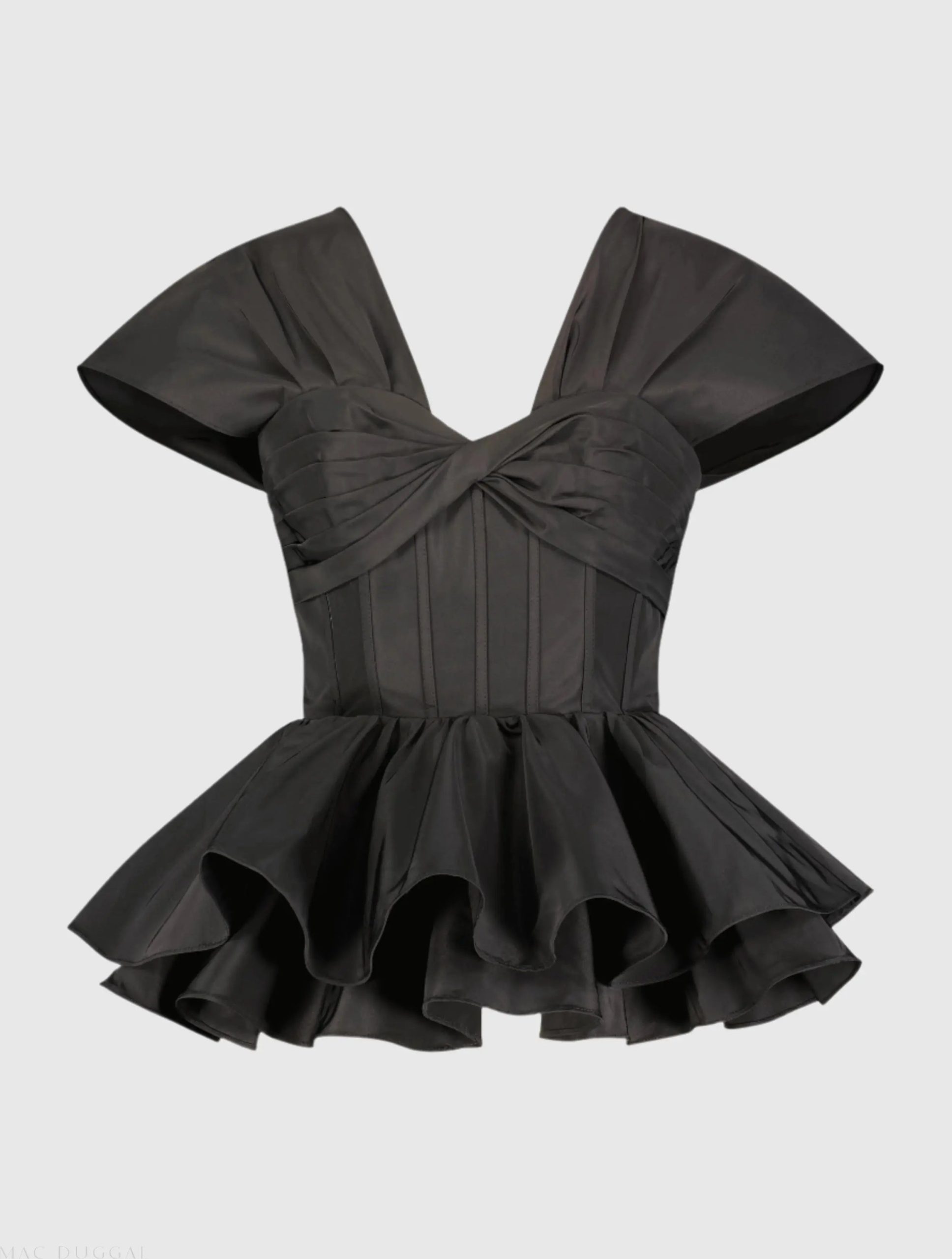 Introducing our Faille Twist Bustier Peplum Top, a blend of contemporary flair and timeless sophistication. This top features a twist detail at the bust and a flattering peplum silhouette, crafted from luxurious faille fabric.