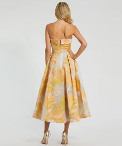 Mac Duggal Women’s Dresses Beige And Orange Strapless Brocade Midi Dress With Pockets | Peach Multi