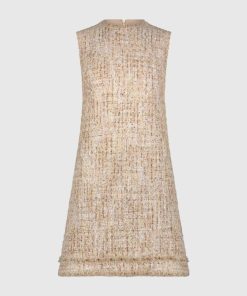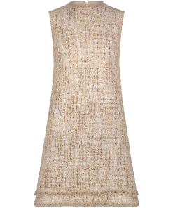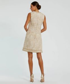 Elevate your style with our Beaded Trim A-Line Mini Shift Dress. This chic sleeveless boucle dress features subtle beaded detailing, a flattering A-line silhouette, and a modern shift design, offering both comfort and sophistication.