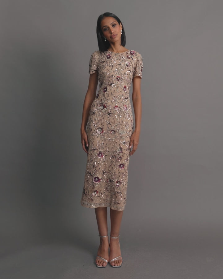 Mac Duggal Women’s Dresses Beige Floral Embellished Short Sleeve Midi Dress | Mocha