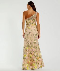 Embrace ethereal elegance in this one shoulder lace embroidered gown. Adorned with intricate floral embroidery and a sleek one shoulder neckline, this gown is perfect for weddings and other special occasions.
