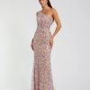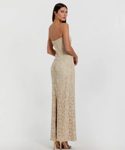 Crafted from beaded lace fabric, this strapless column gown features a sleeveless design and a flattering sweetheart neckline. Exude timeless glamour in this stunning gown.
