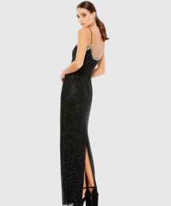 Stunning fully-beaded column gown accented with a rhinestone-encrusted scoop neckline and subtle back slit.