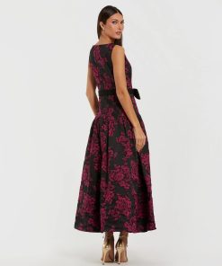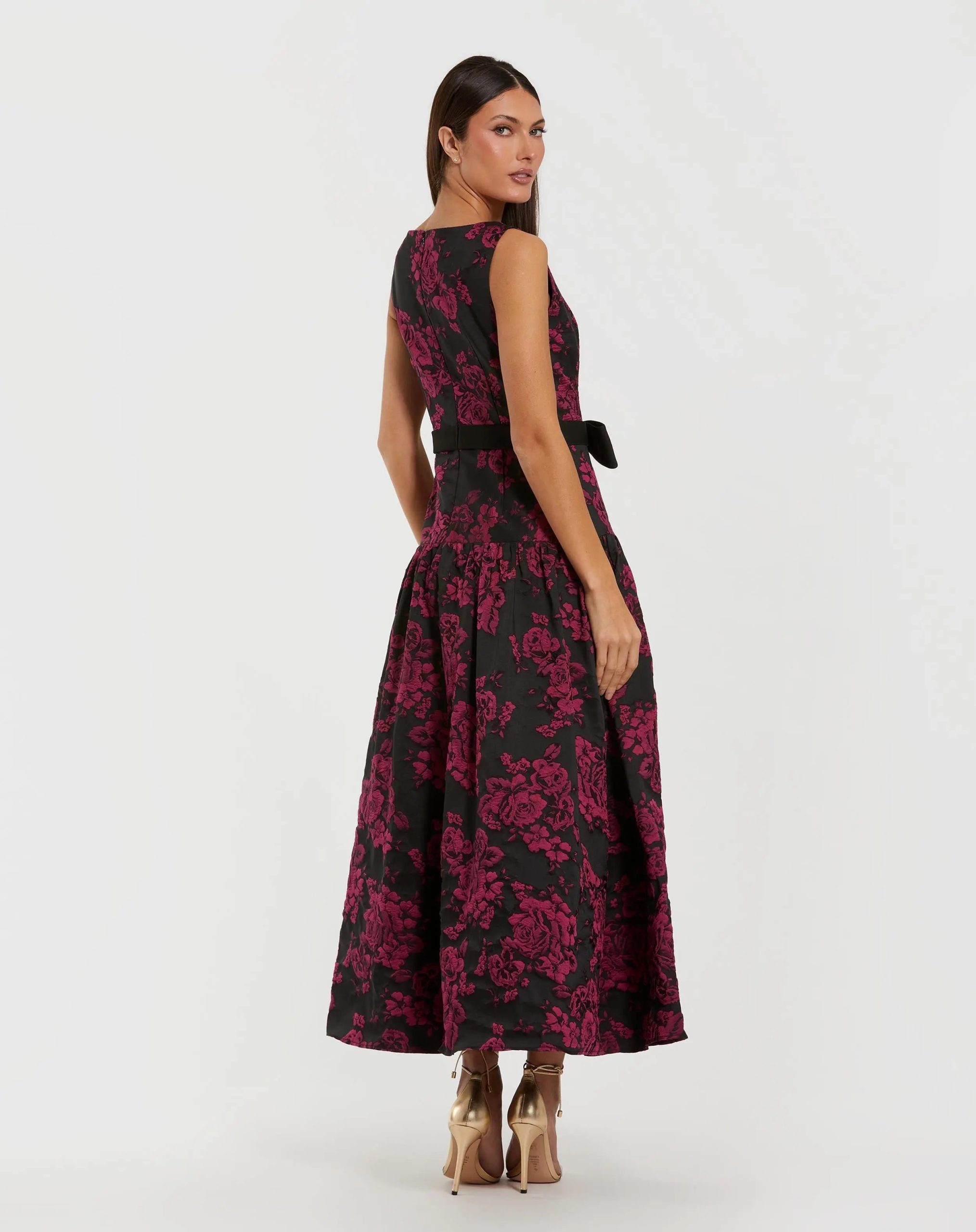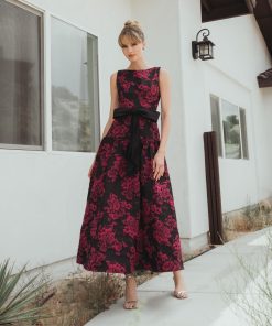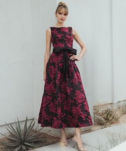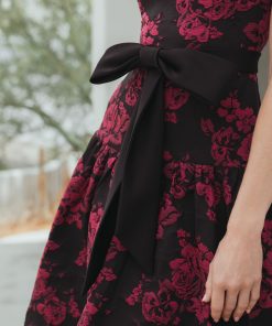 This beautiful brocade dress blends timeless elegance with modern charm. Featuring a classic boat neckline, drop waist silhouette, and eye-catching satin bow, it’s the perfect dress for cocktail parties and soirees.