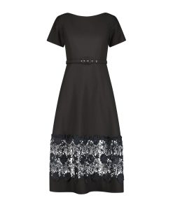 Perfect for daytime events and cocktail parties, this beautiful midi dress features a boat neckline, flattering belted waist, and stunning cut-out applique detail.