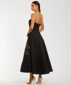 Mac Duggal Women’s Dresses Black Crepe Printed Strapless Midi Dress With Pockets | Black