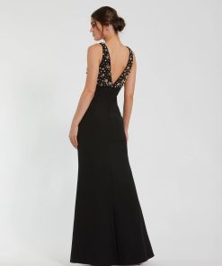Mac Duggal Women’s Dresses Black Crepe Sleeveless Beaded V Neck Gown With Bow | Black
