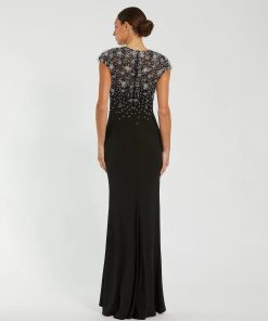 This sleek gown features jersey fabric for a comfortable and elegant fit. The heat-set crystal embellishments add a touch of glamour, while the short cap sleeves provide a modern and chic look. Perfect for any special occasion, this dress exudes sophistication and style.