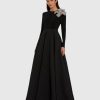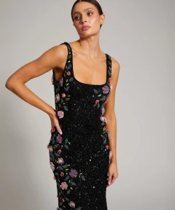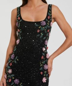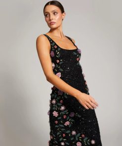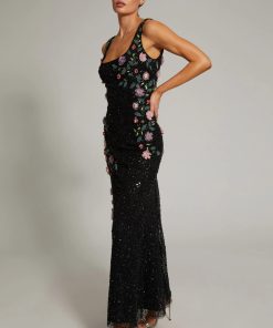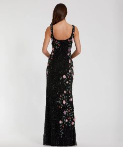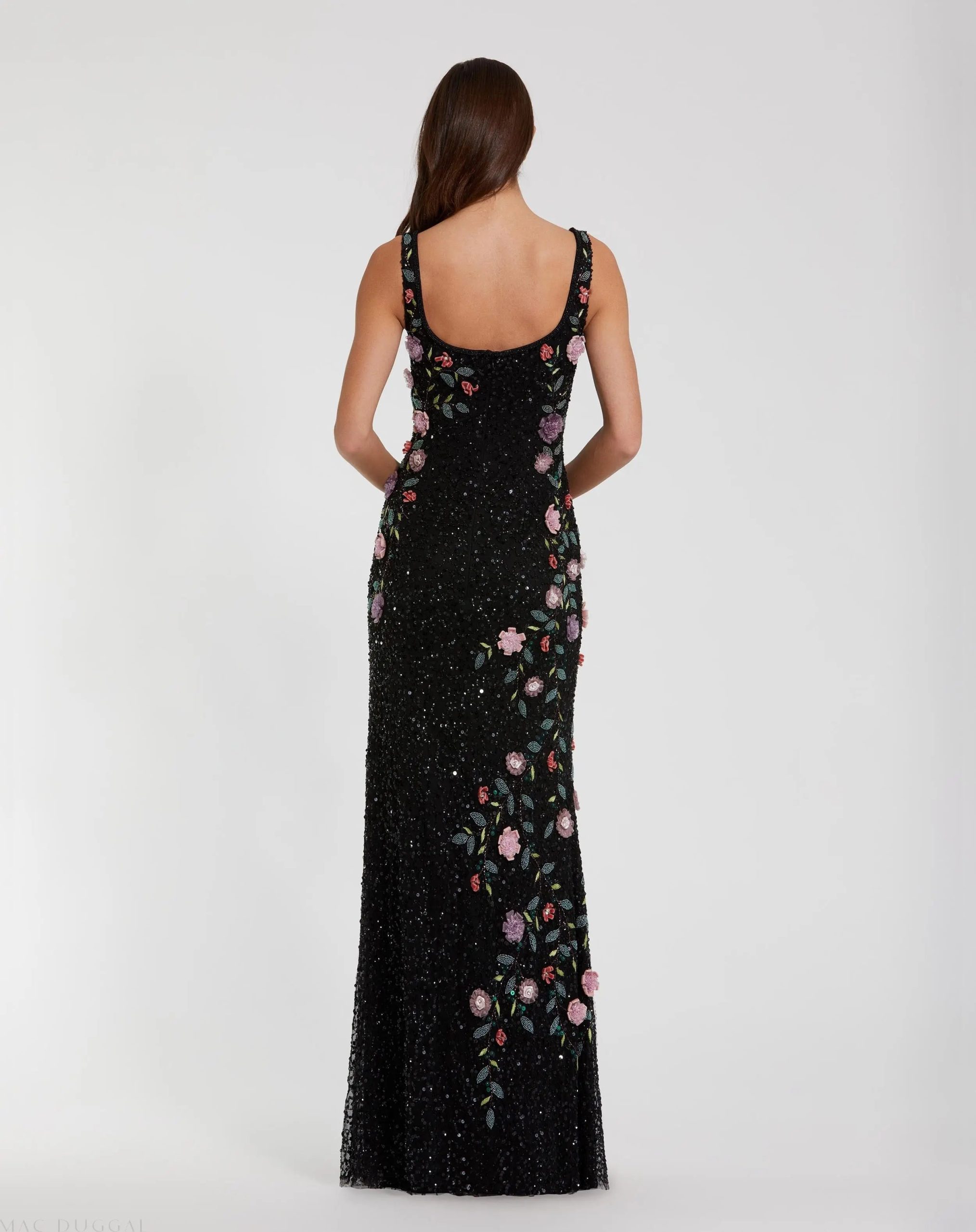 This sleeveless gown features embellished fabric, a scoop neckline, and intricate 3D floral detail. The elegant design adds a touch of luxury and glamour to any special occasion.