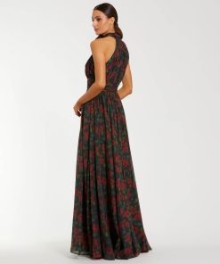 Mac Duggal Women’s Dresses Black Floral Print Halter Neck Gown With Rosette | Black