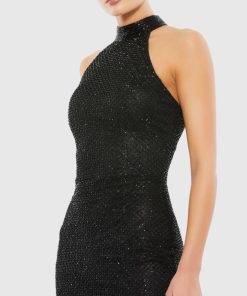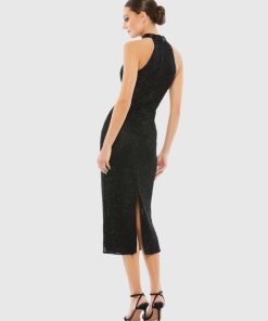 Chic high-neck halter midi dress with diamond-patterned beading throughout the overlay. This midi sheath dress features a back zipper and back center slit.