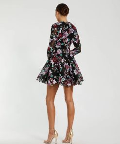 - Floral embroidery accented by hand stitched sequins