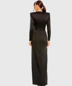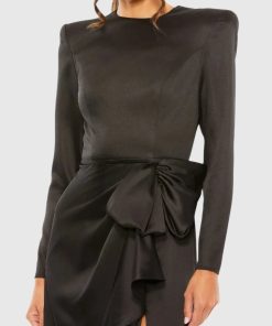 Mac Duggal Women’s Dresses Black Long Sleeve Satin Structured Bow Draped Column Gown | Black
