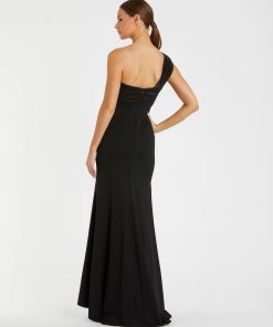 This sleek gown features an asymmetrical sweetheart neckline, satin bodice, and a flattering trumpet silhouette. Perfect for galas and black-tie affairs.